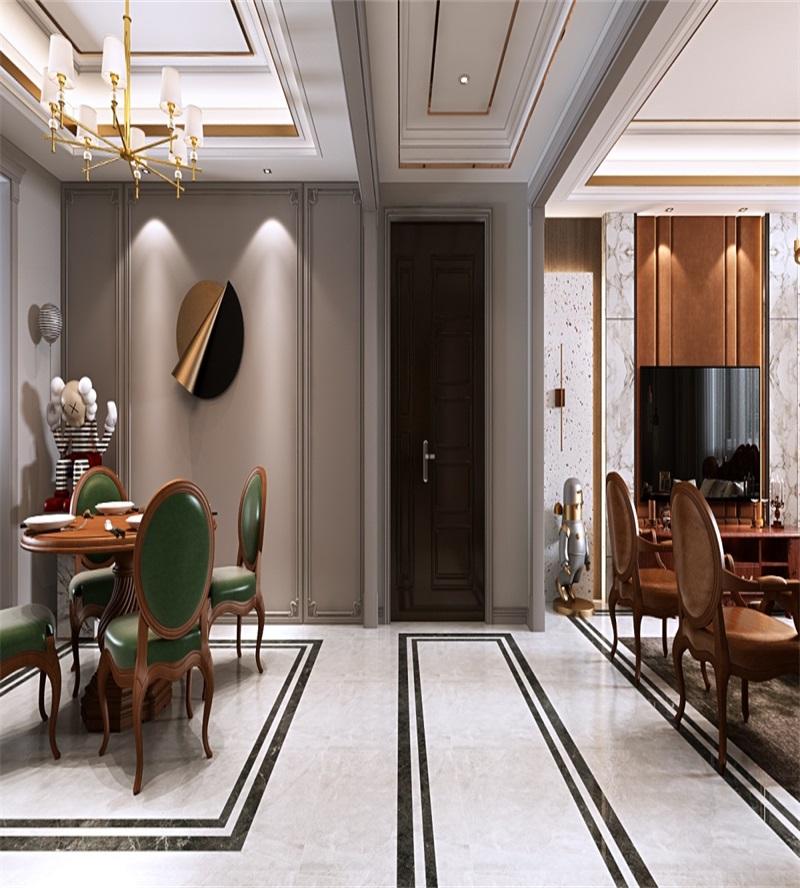 美式裝修的地面主要采用仿古磚、做舊地板來進行裝飾,打造打造出一種溫馨自然的家居感覺,地面的地腳線設計要與門套線相連接,這樣能夠讓整個空間線條更加流暢。