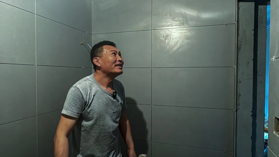 “也有累的時(shí)候,但是看你怎么去看待問題,這個(gè)是我吃飯的手藝,你看這磚你粘完這一小塊就亮了,然后你把這面墻粘完這面墻就亮了,你把這個(gè)屋粘完,這個(gè)屋就亮了!“