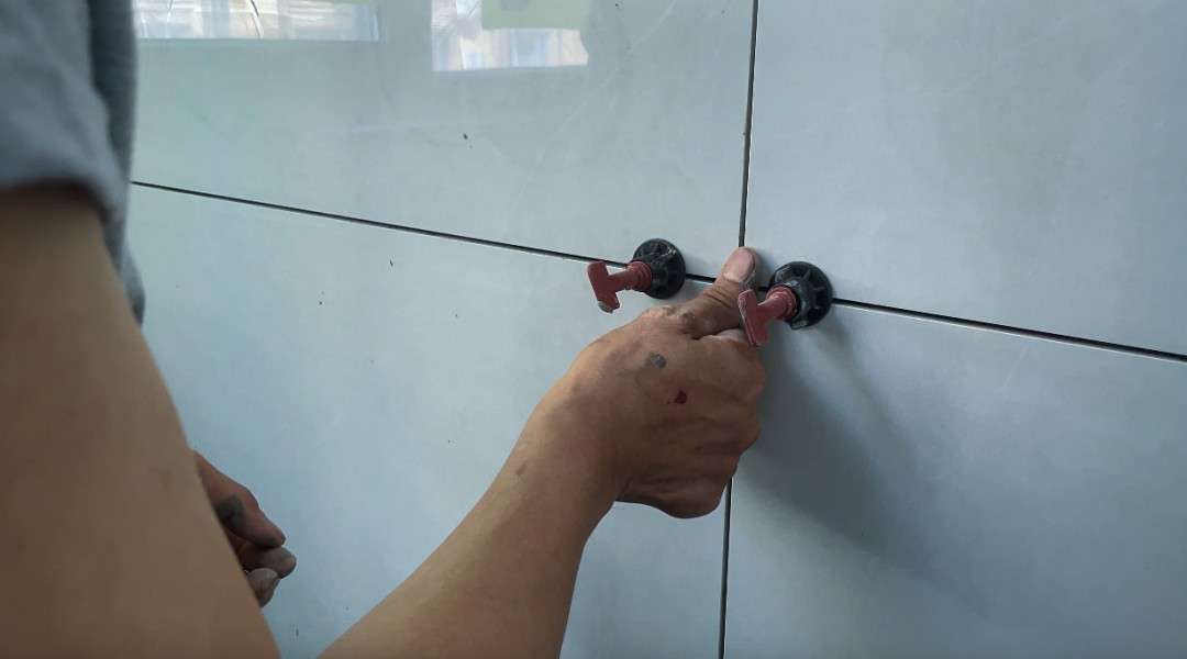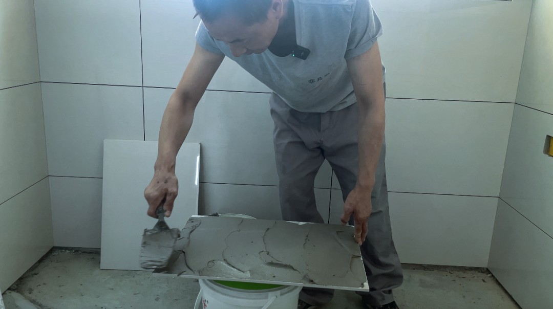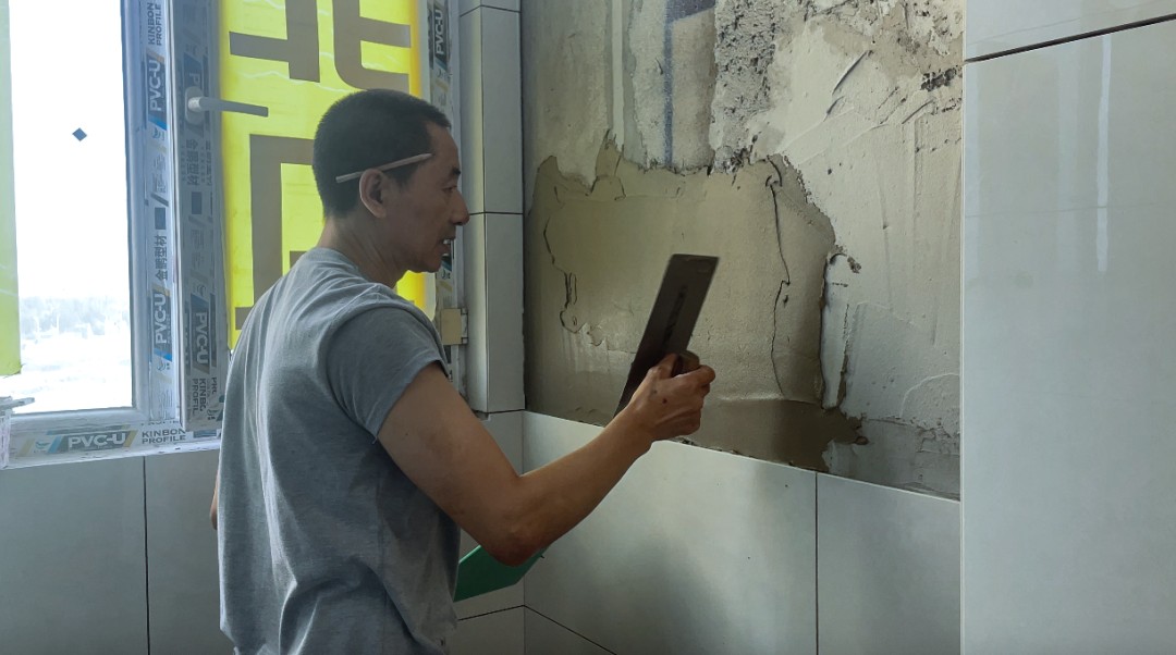 談到每一塊磚他是如何掌握厚度,并能保持一致的,他這樣回答:“我這都是笨方法,我用這個抹子在涂好的瓷磚膠上磕一下,就知道大概的厚度了,剩下的瓷磚全都保持一樣的厚度,這方法笨,但也挺好用的,都是自己研究總結。”