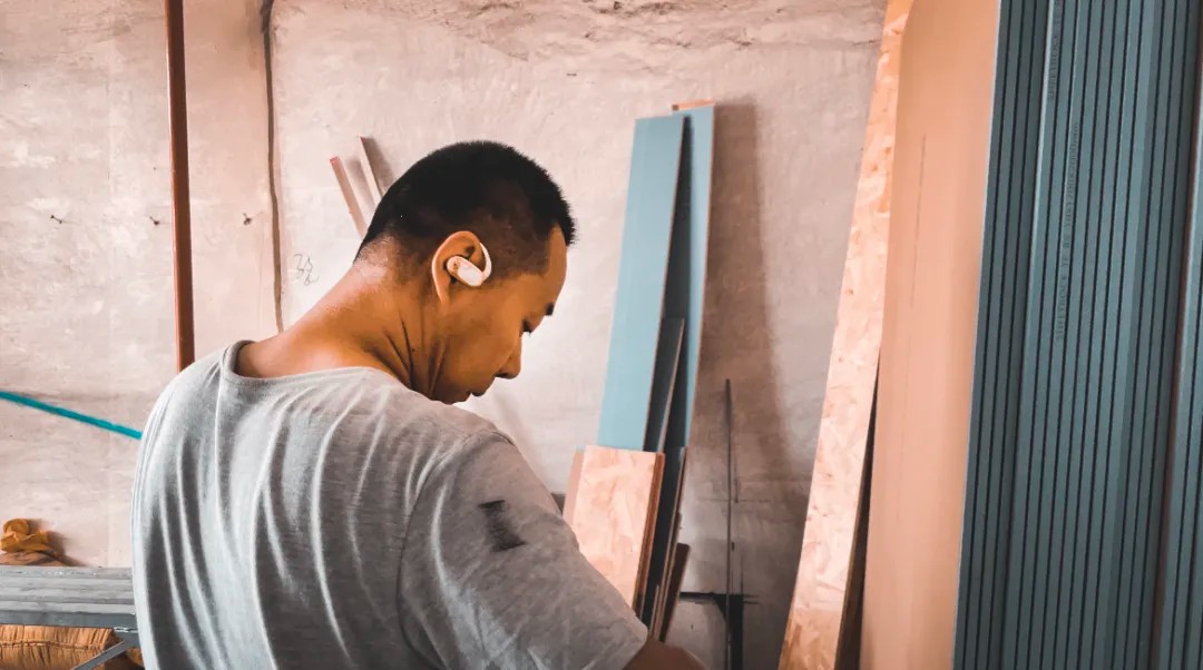 周末的老小區(qū)格外靜謐,郭軍師傅的身影安靜地落在木料堆上,手中的筆在板子上細細游走,記錄著尺寸與用料。