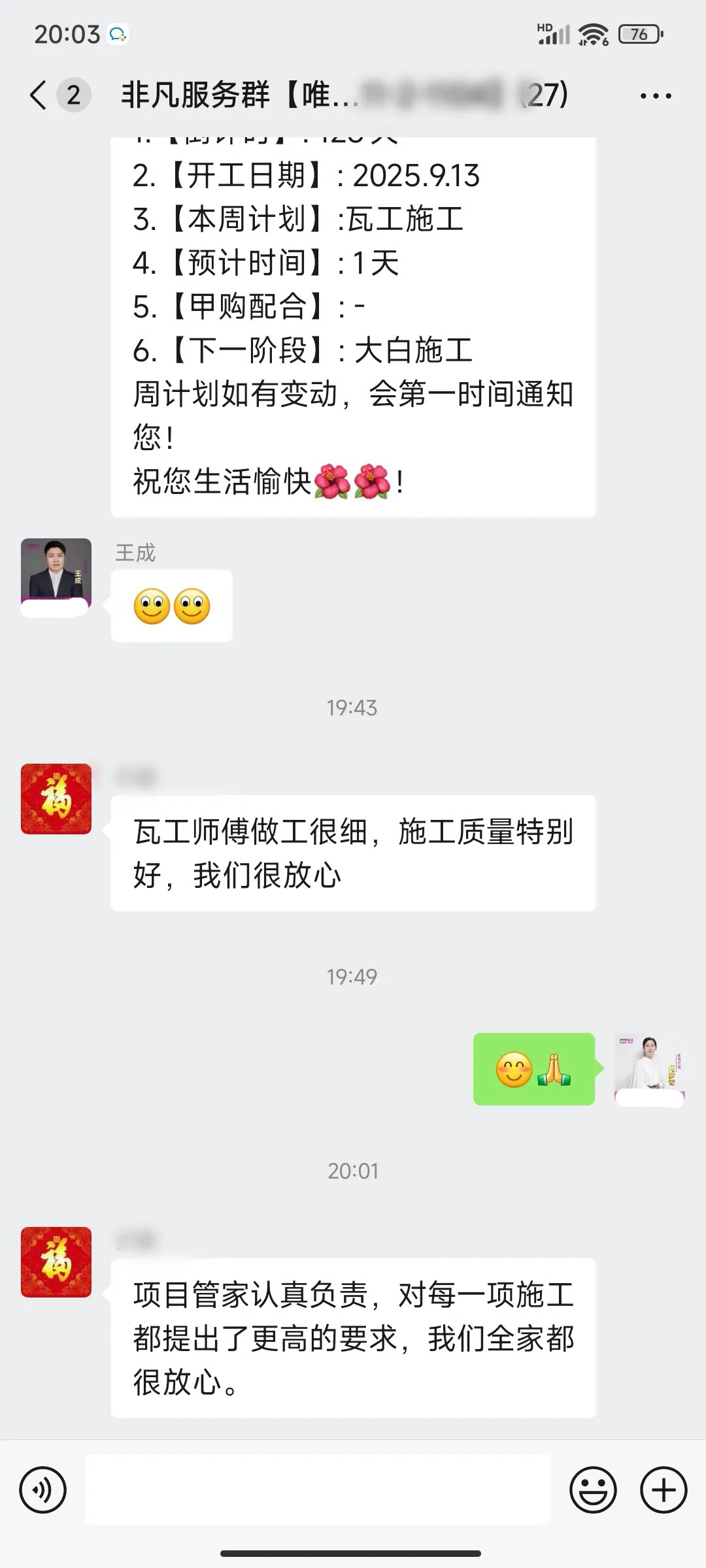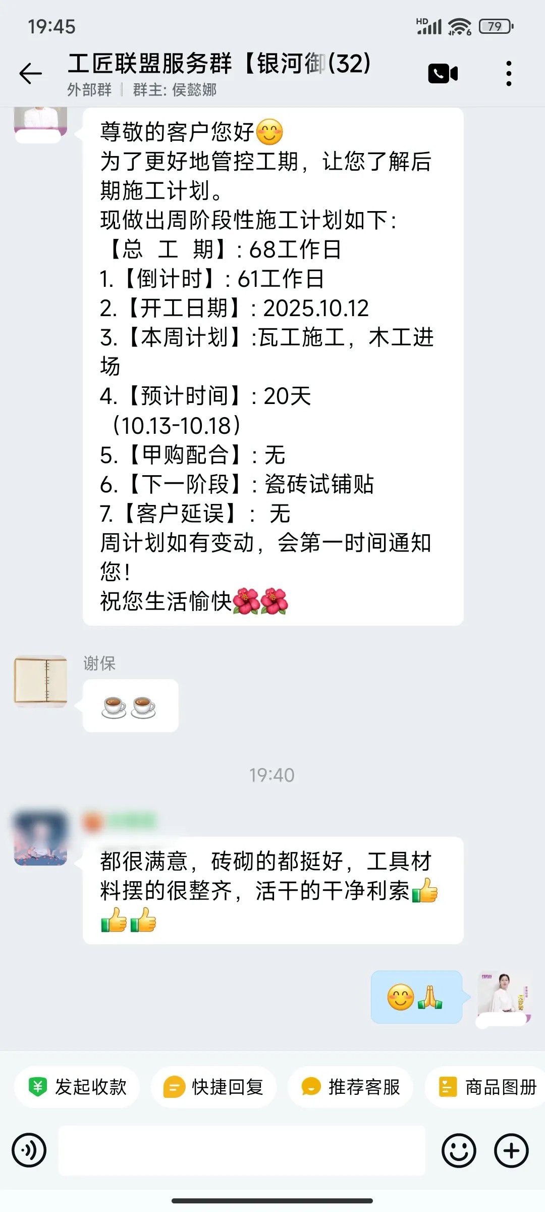 每個(gè)專屬服務(wù)群,都是一個(gè)家的成長日記,更是一座堅(jiān)實(shí)的溝通橋梁。在這里,您無需反復(fù)追問,項(xiàng)目進(jìn)展會(huì)主動(dòng)呈報(bào);您不必?fù)?dān)心遺漏,關(guān)鍵節(jié)點(diǎn)皆有影像留存。