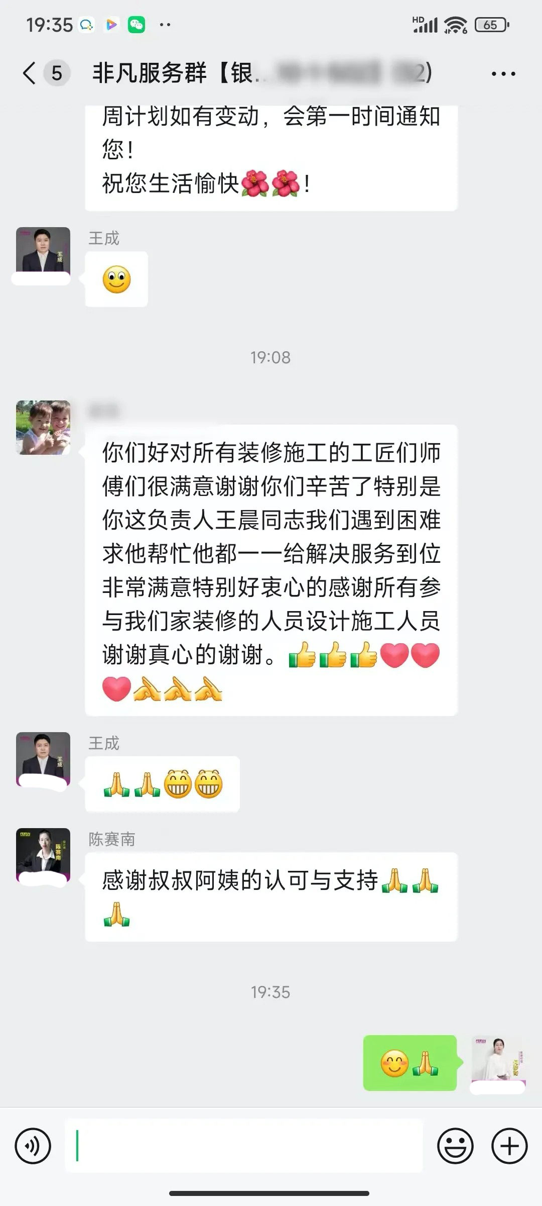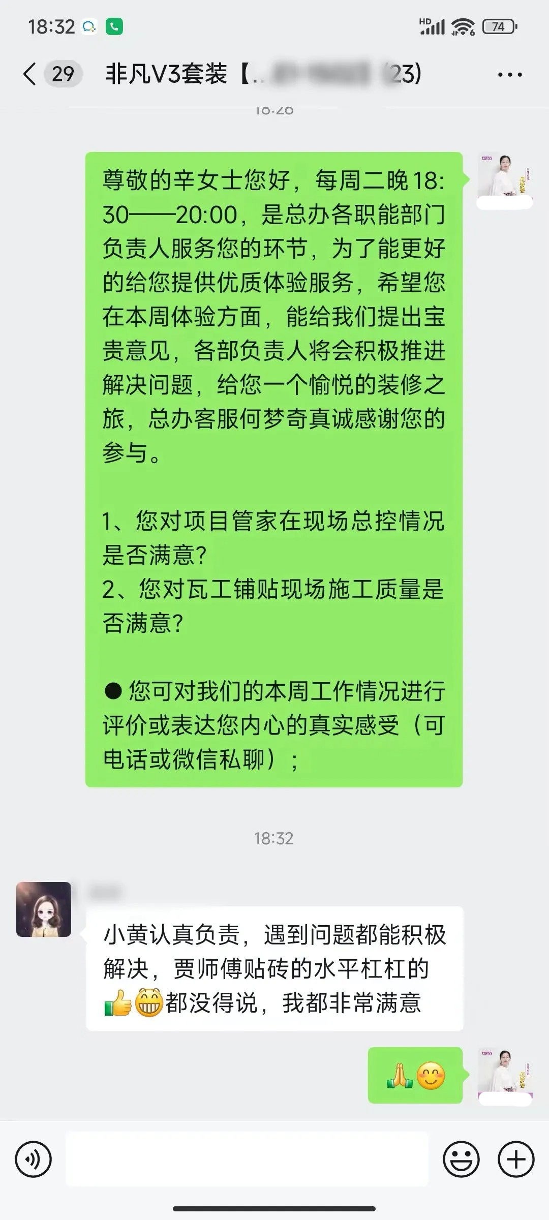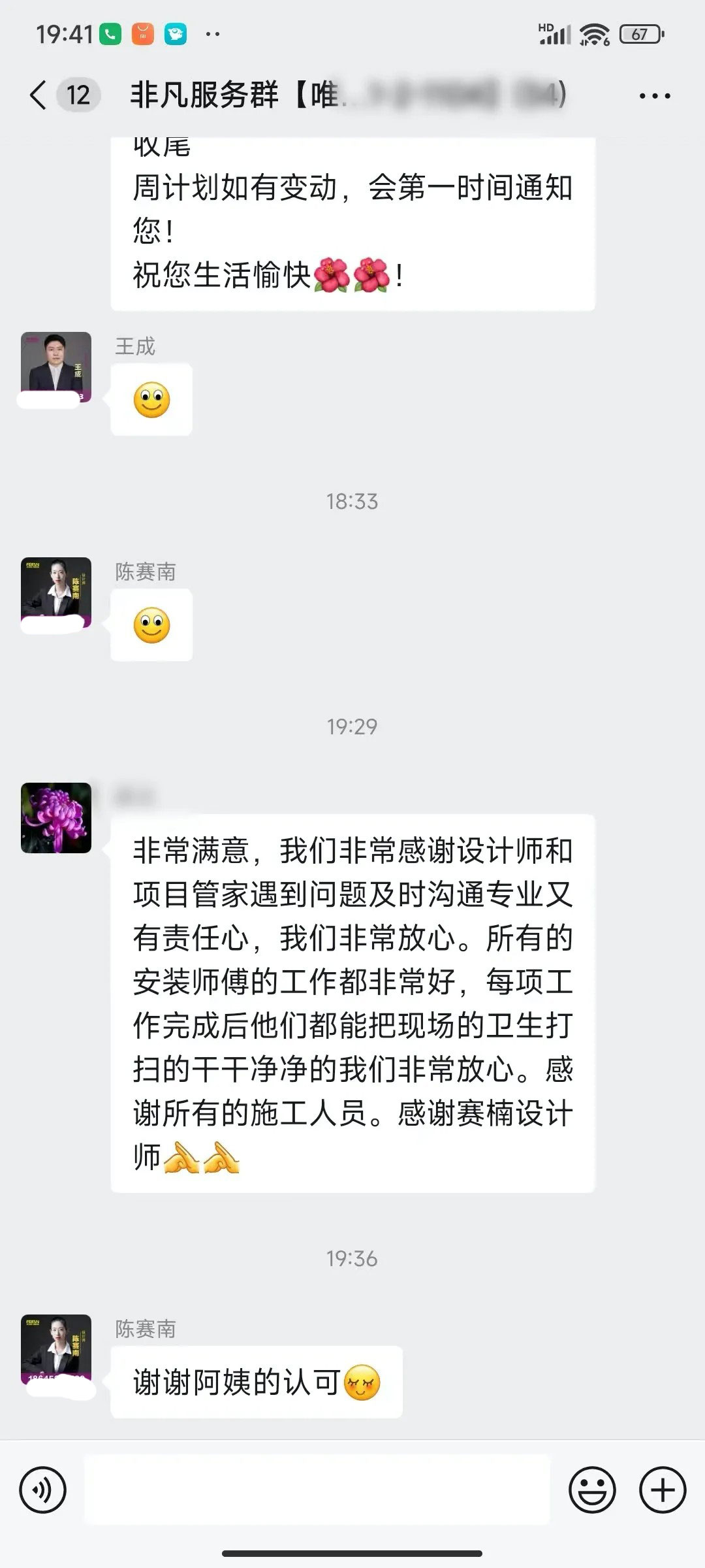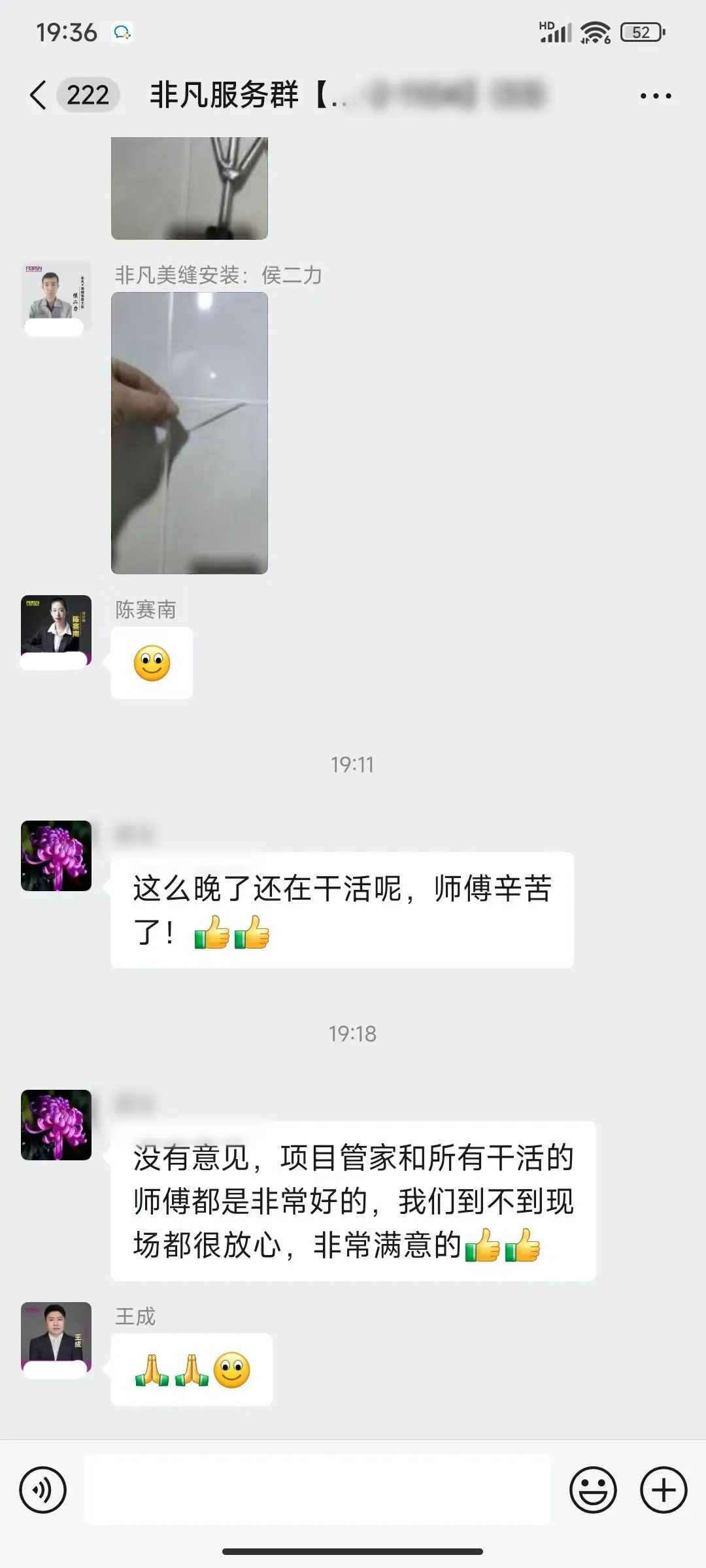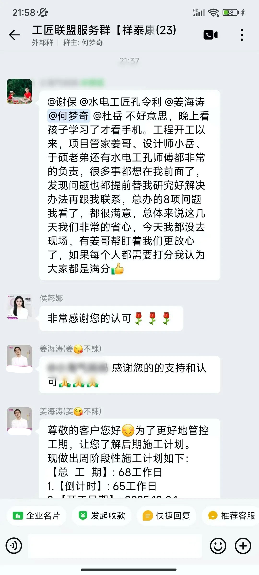 這一年,每個專屬服務(wù)群都像一座溫暖的燈塔。它不僅是進(jìn)度的播報站,更是隨時可問的答疑窗、突發(fā)狀況的應(yīng)急所。我們堅持用透明的信息流,驅(qū)散裝修中的未知與焦慮,讓您即使從未親臨工地,也能擁有如現(xiàn)場般的掌控感與安心。這份貫穿始終的陪伴,是我們對“服務(wù)”最基礎(chǔ)也最鄭重的承諾。
