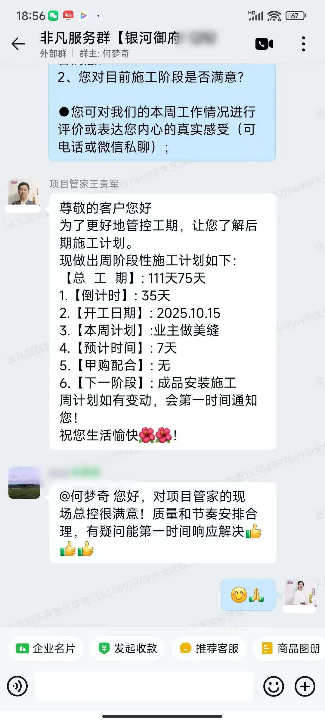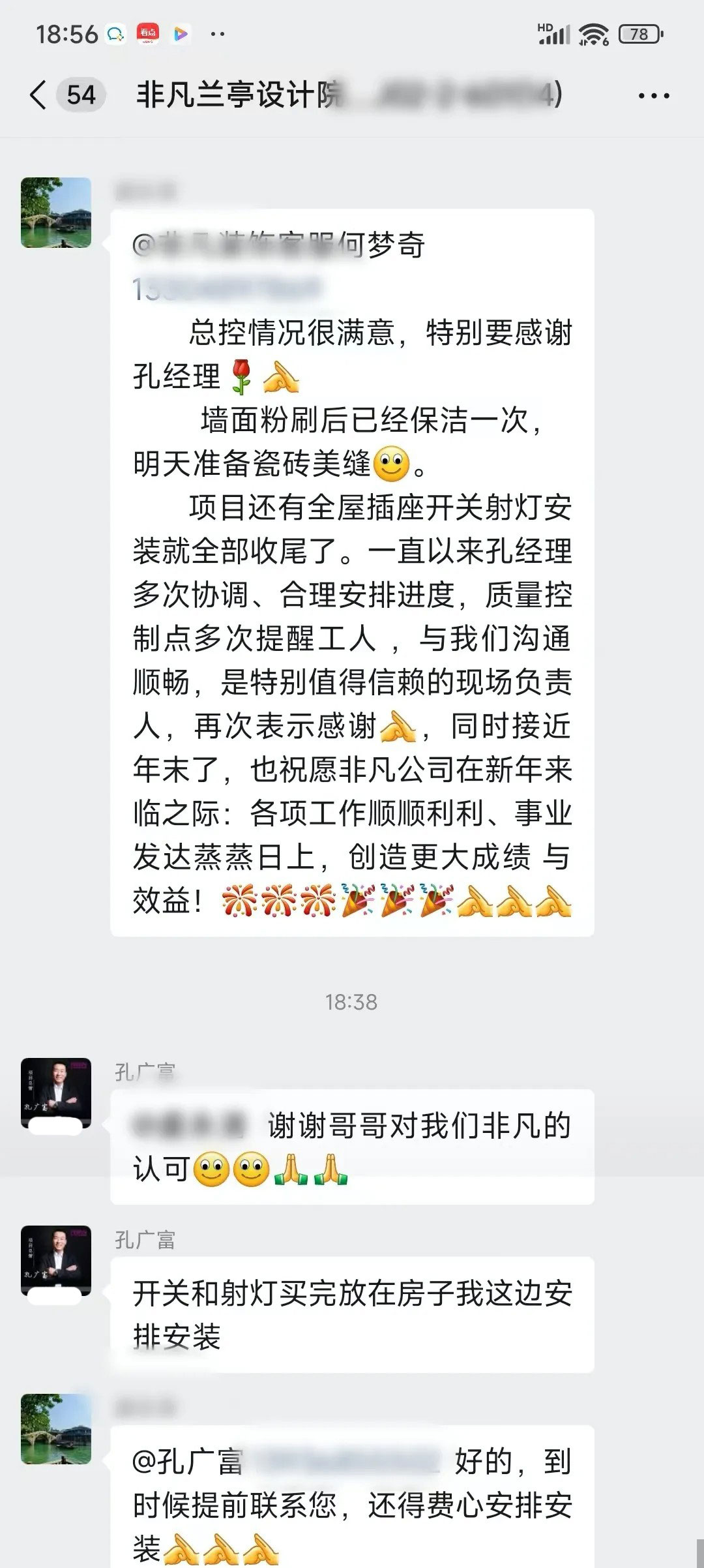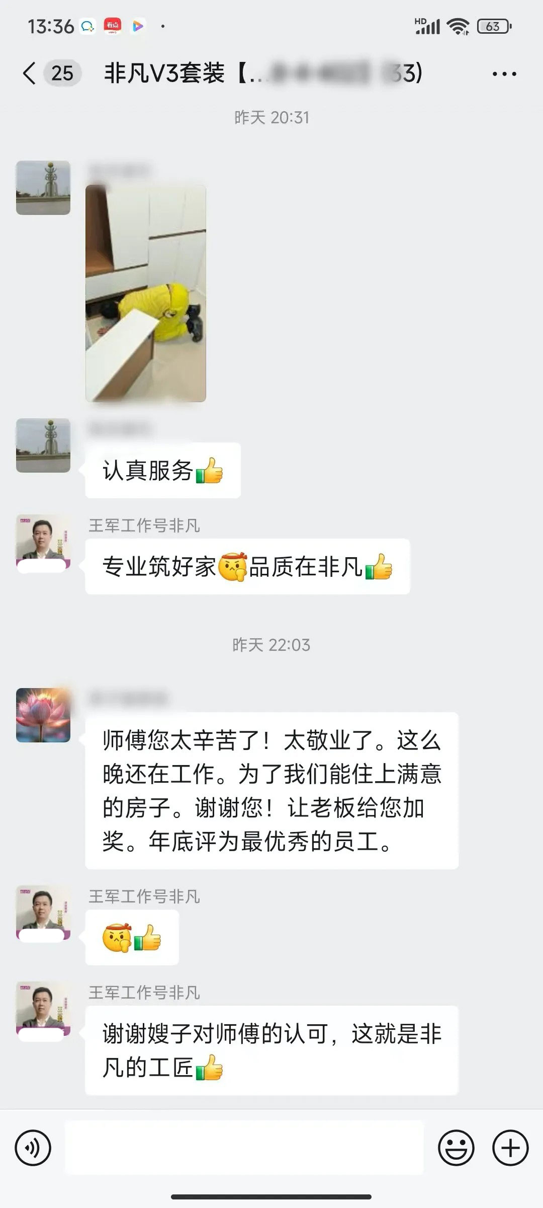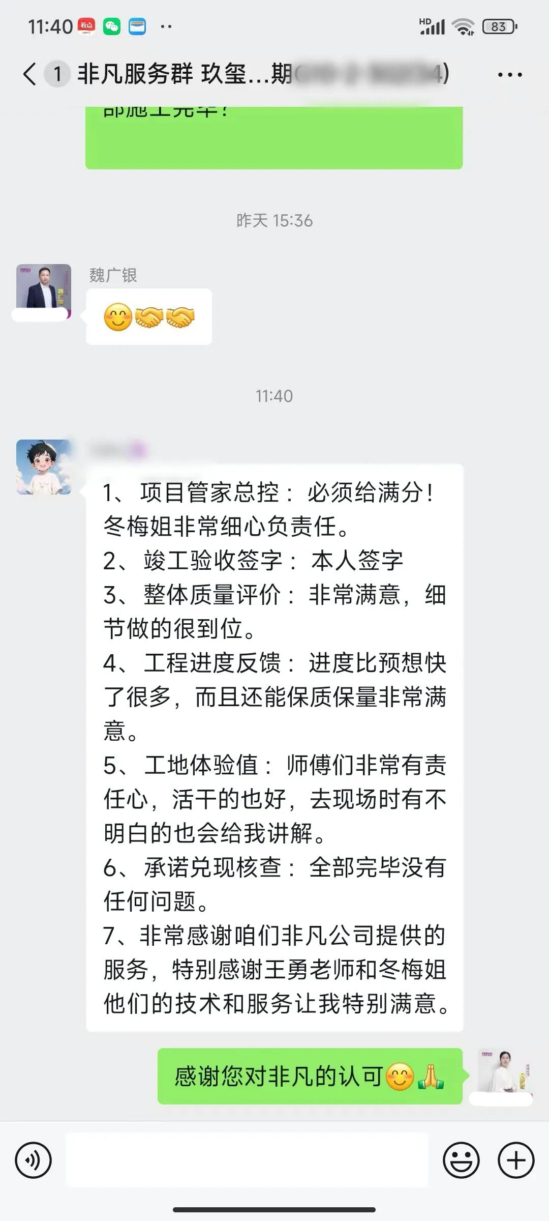 這一年,每個專屬服務(wù)群都像一座溫暖的燈塔。它不僅是進(jìn)度的播報站,更是隨時可問的答疑窗、突發(fā)狀況的應(yīng)急所。我們堅持用透明的信息流,驅(qū)散裝修中的未知與焦慮,讓您即使從未親臨工地,也能擁有如現(xiàn)場般的掌控感與安心。這份貫穿始終的陪伴,是我們對“服務(wù)”最基礎(chǔ)也最鄭重的承諾。