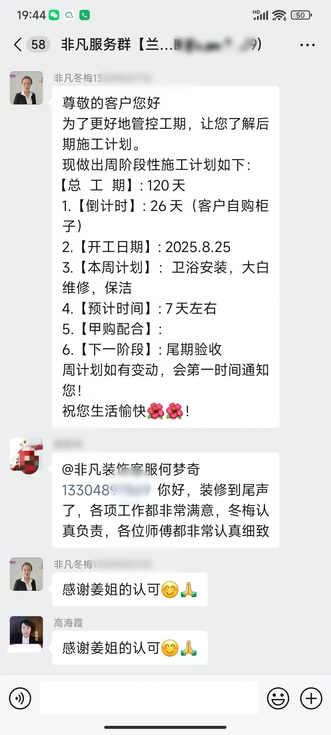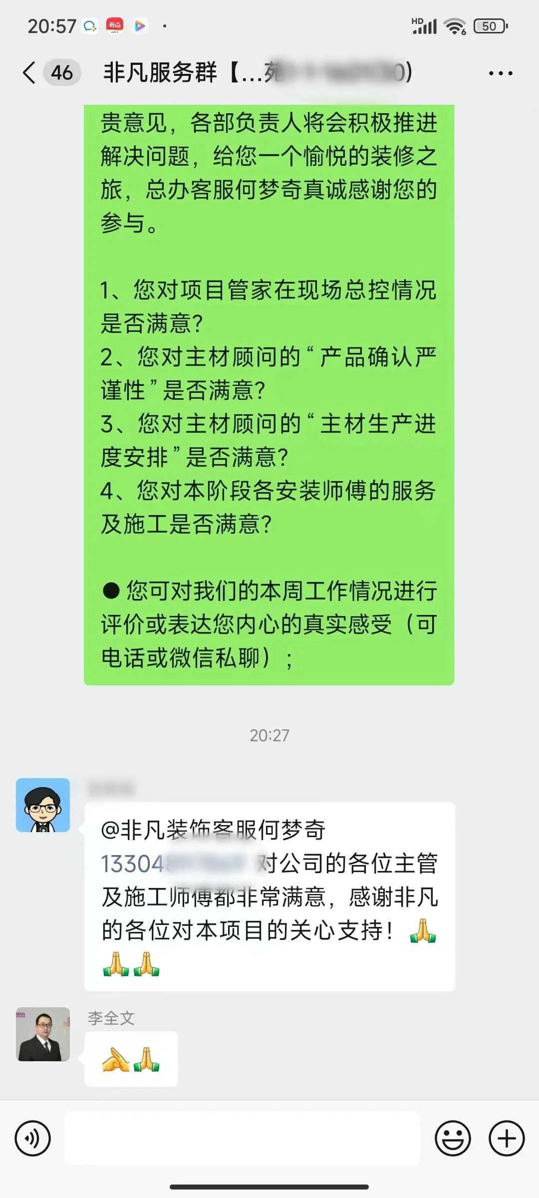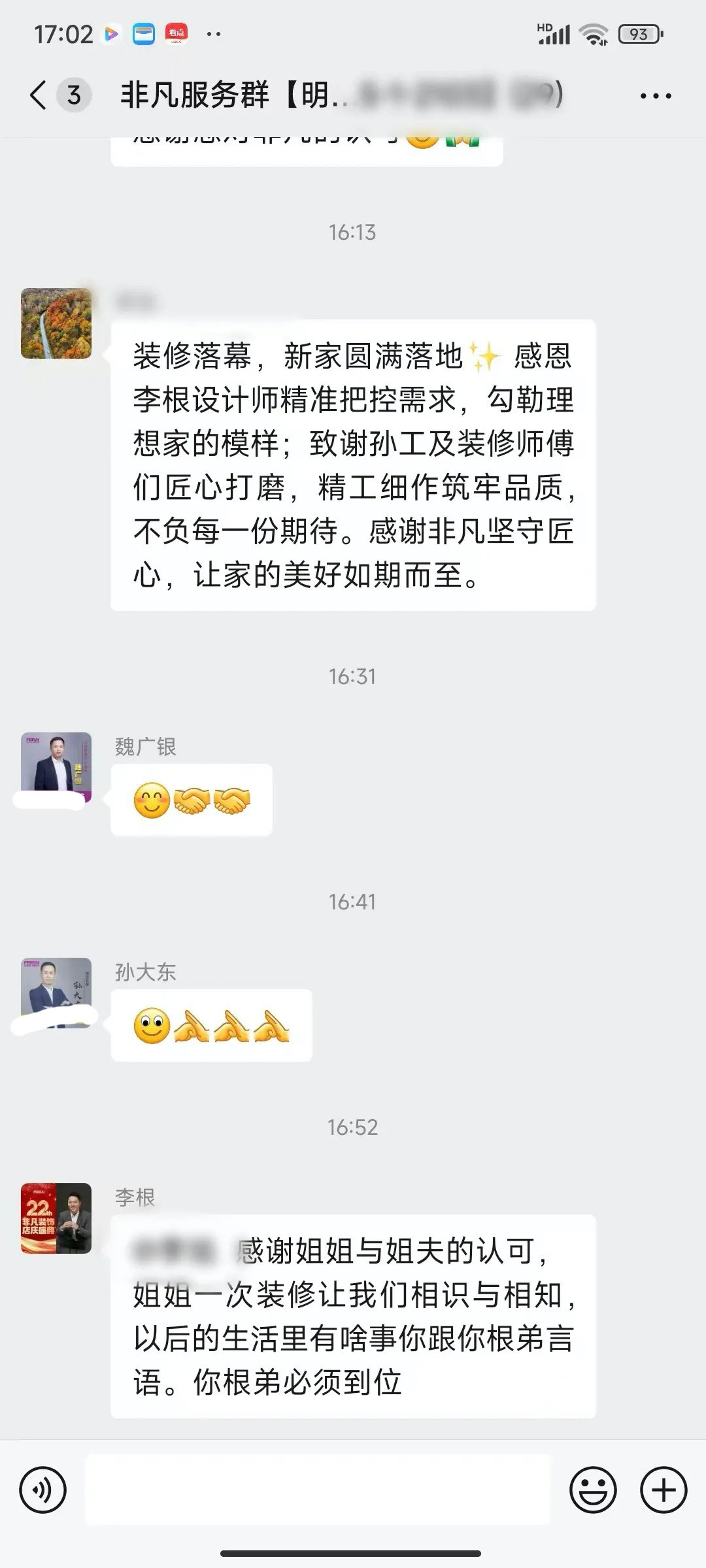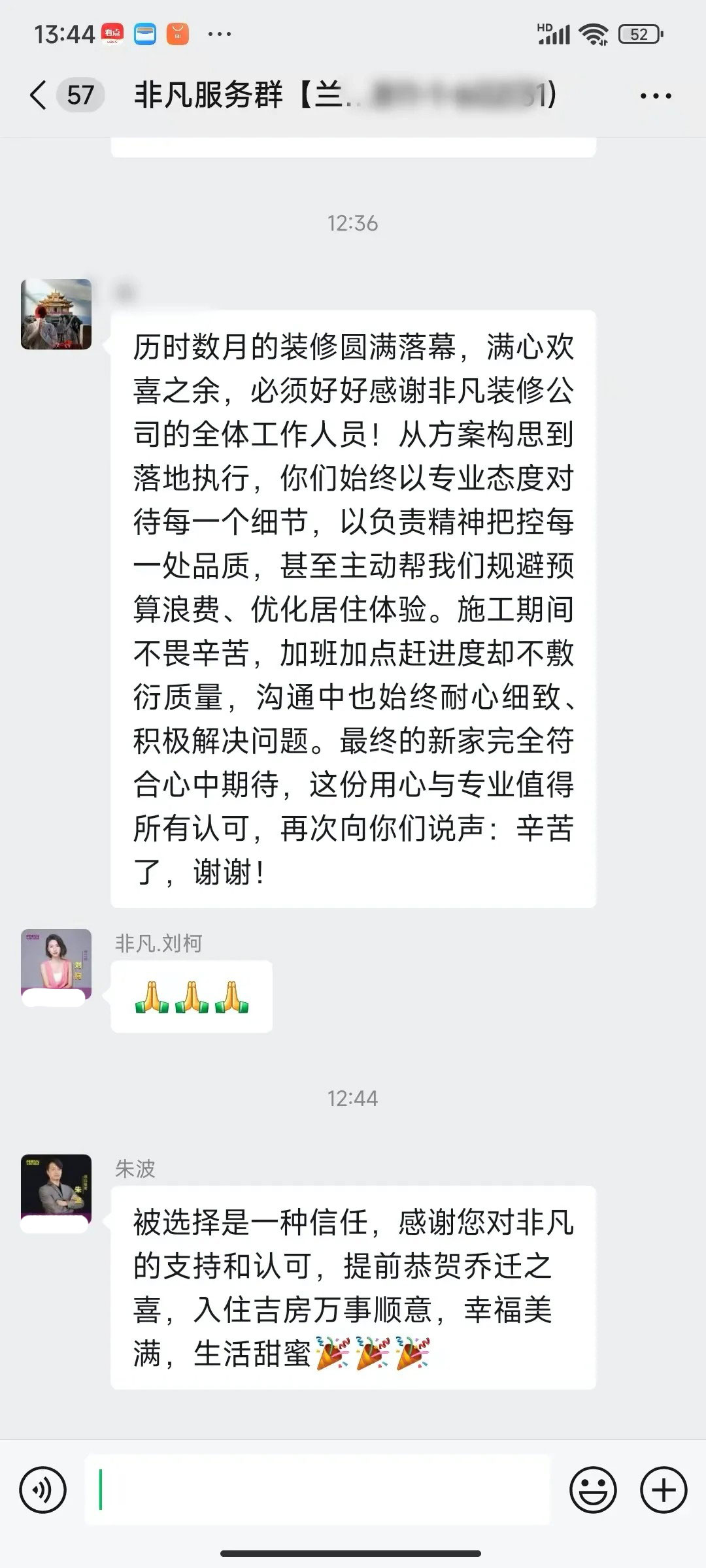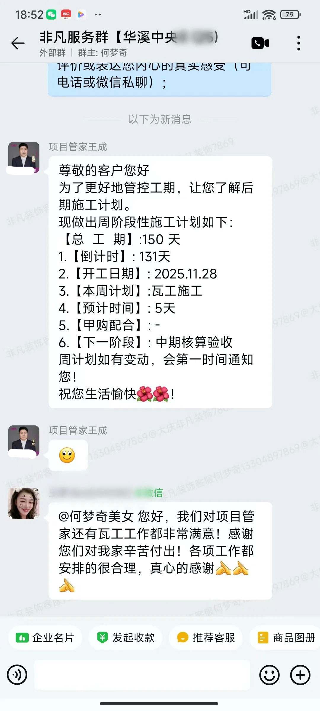 這一年,每個專屬服務(wù)群都像一座溫暖的燈塔。它不僅是進(jìn)度的播報站,更是隨時可問的答疑窗、突發(fā)狀況的應(yīng)急所。我們堅持用透明的信息流,驅(qū)散裝修中的未知與焦慮,讓您即使從未親臨工地,也能擁有如現(xiàn)場般的掌控感與安心。這份貫穿始終的陪伴,是我們對“服務(wù)”最基礎(chǔ)也最鄭重的承諾。