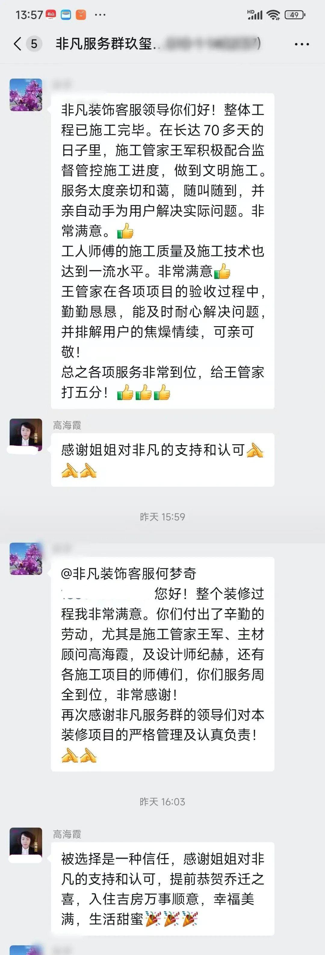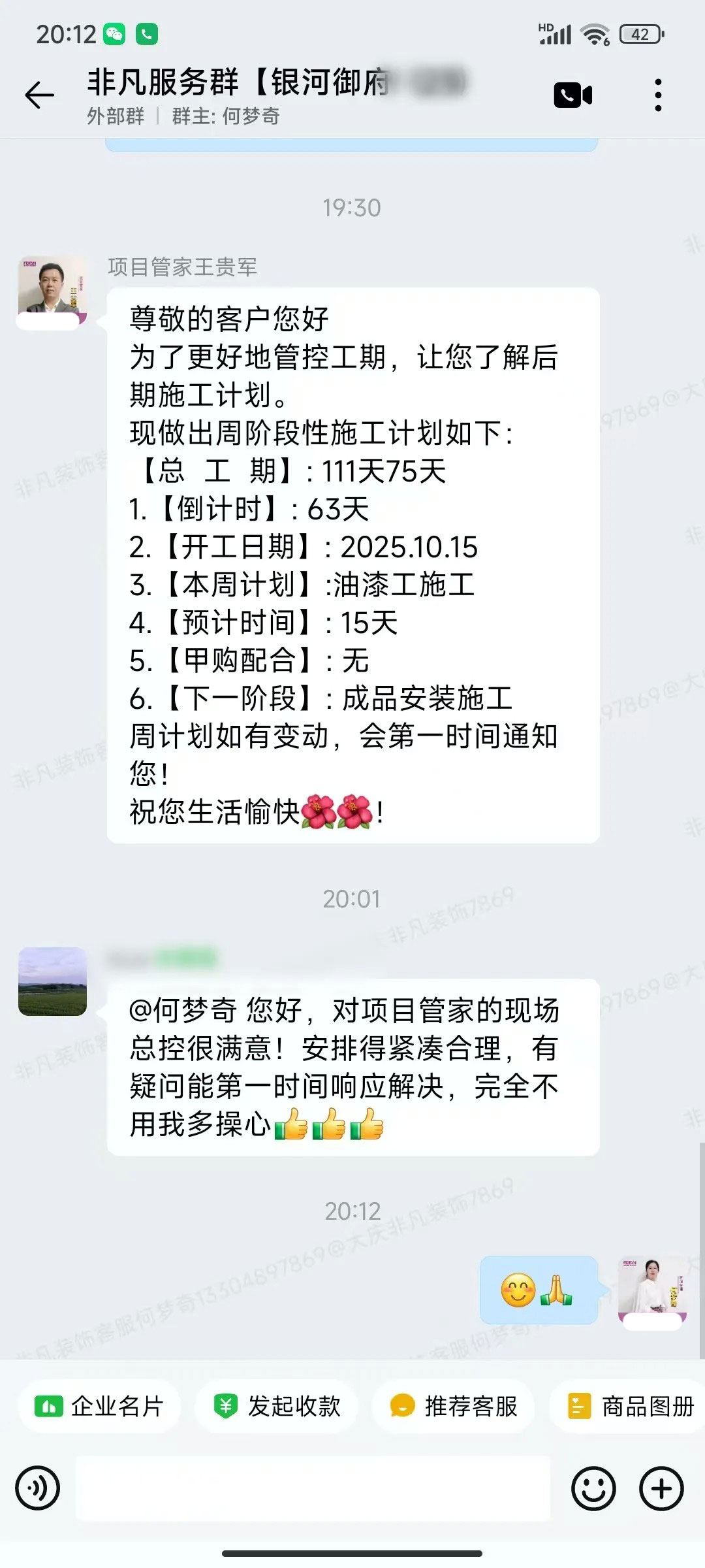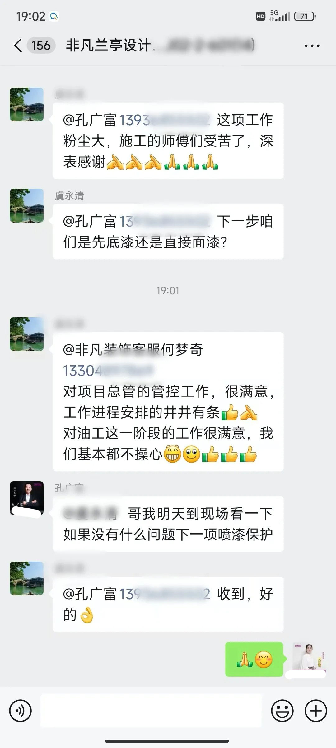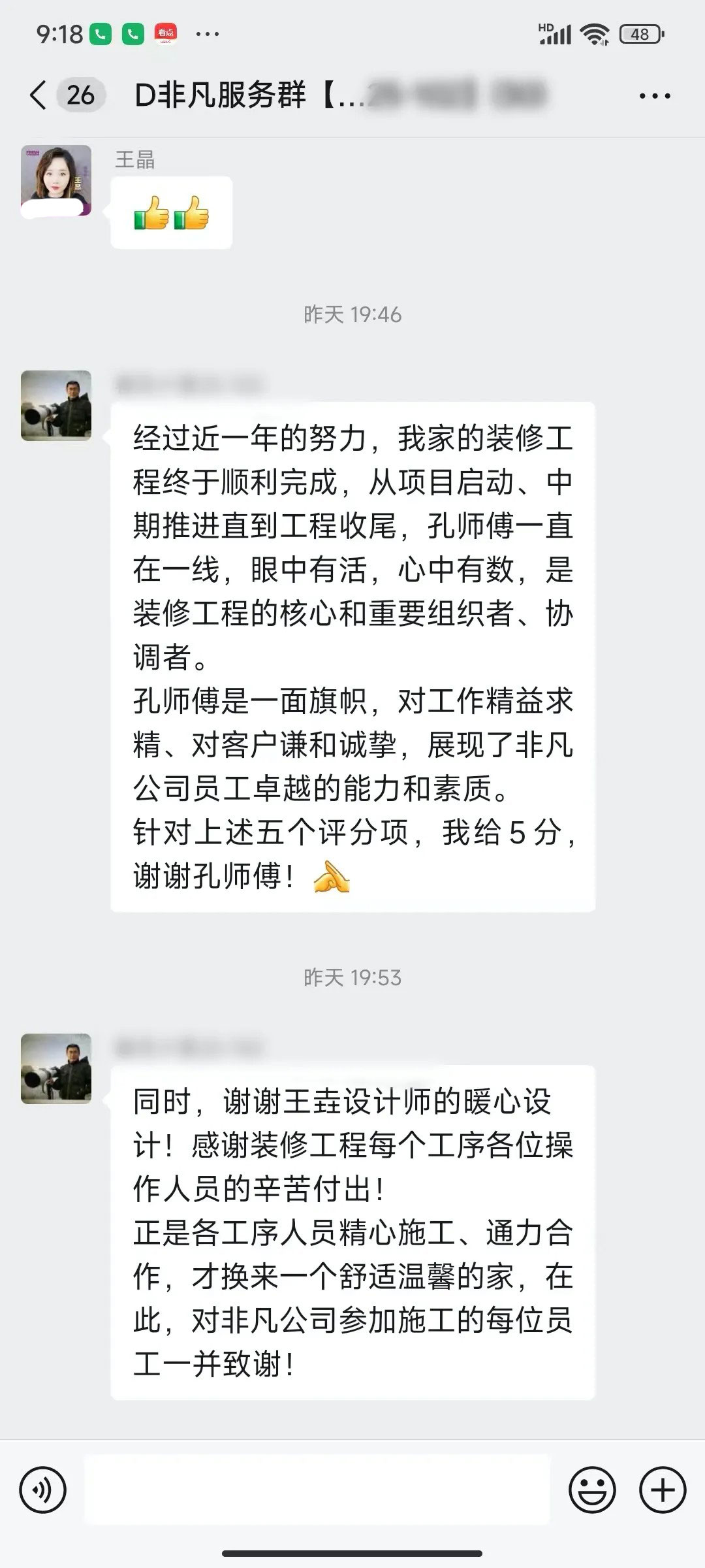 這一年,每個專屬服務(wù)群都像一座溫暖的燈塔。它不僅是進(jìn)度的播報站,更是隨時可問的答疑窗、突發(fā)狀況的應(yīng)急所。我們堅持用透明的信息流,驅(qū)散裝修中的未知與焦慮,讓您即使從未親臨工地,也能擁有如現(xiàn)場般的掌控感與安心。這份貫穿始終的陪伴,是我們對“服務(wù)”最基礎(chǔ)也最鄭重的承諾。